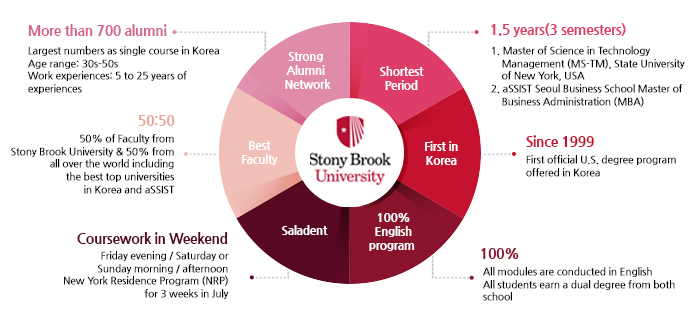 Since 1999, a top 1% business school program conducted in Korea, offering a regular master's degree from State University of New York at Stony Brook.